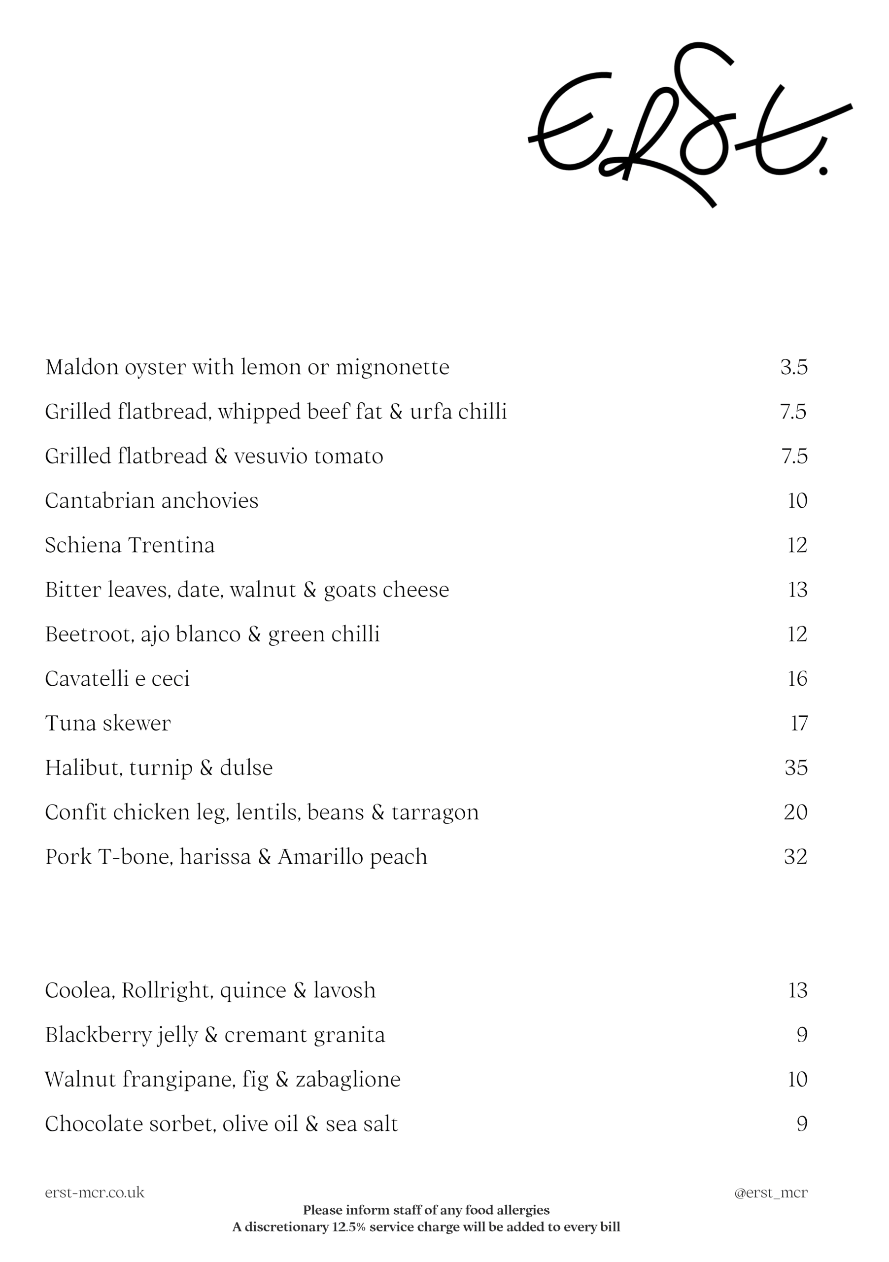 Please contact: bookings@erstrestaurant.co.uk